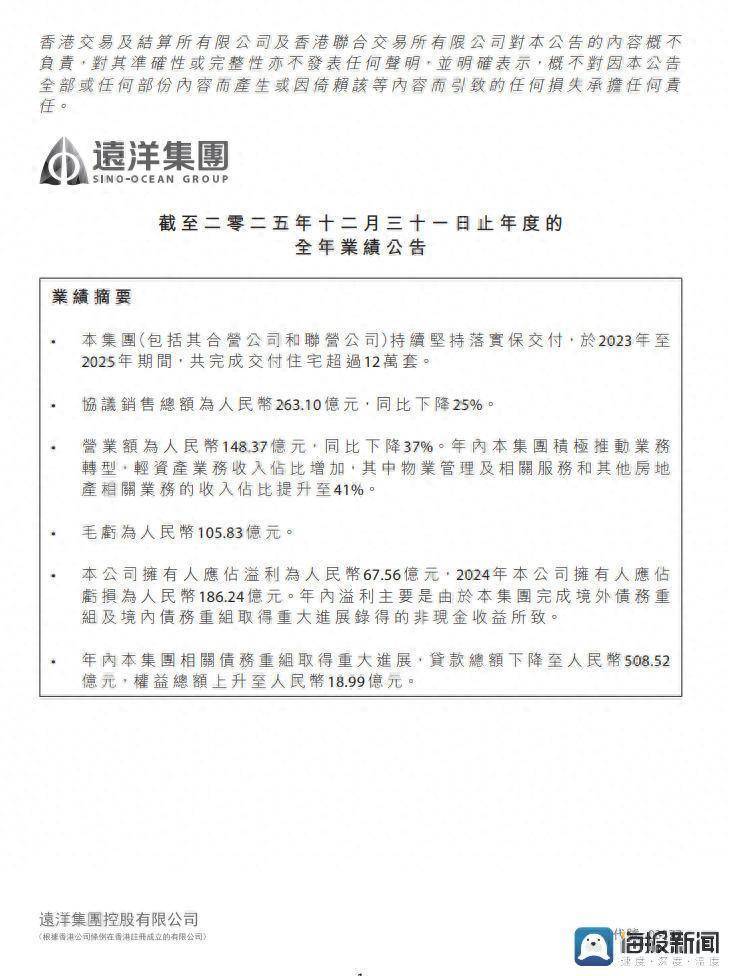 远洋集团2025年业绩报显示,年内溢利主要是由于本集团完成境外债务重组及境内债务重组取得重大进展录得的非现金收益所致。